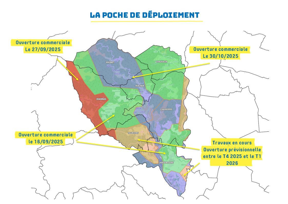 La commercialisation des services fibre a démarré le 16 septembre sur Chazeaux, Chassiers, Joannas, Rocher et Largentière, puis le 27 septembre sur la seconde partie de Joannas (périmètres en vert et rouge).