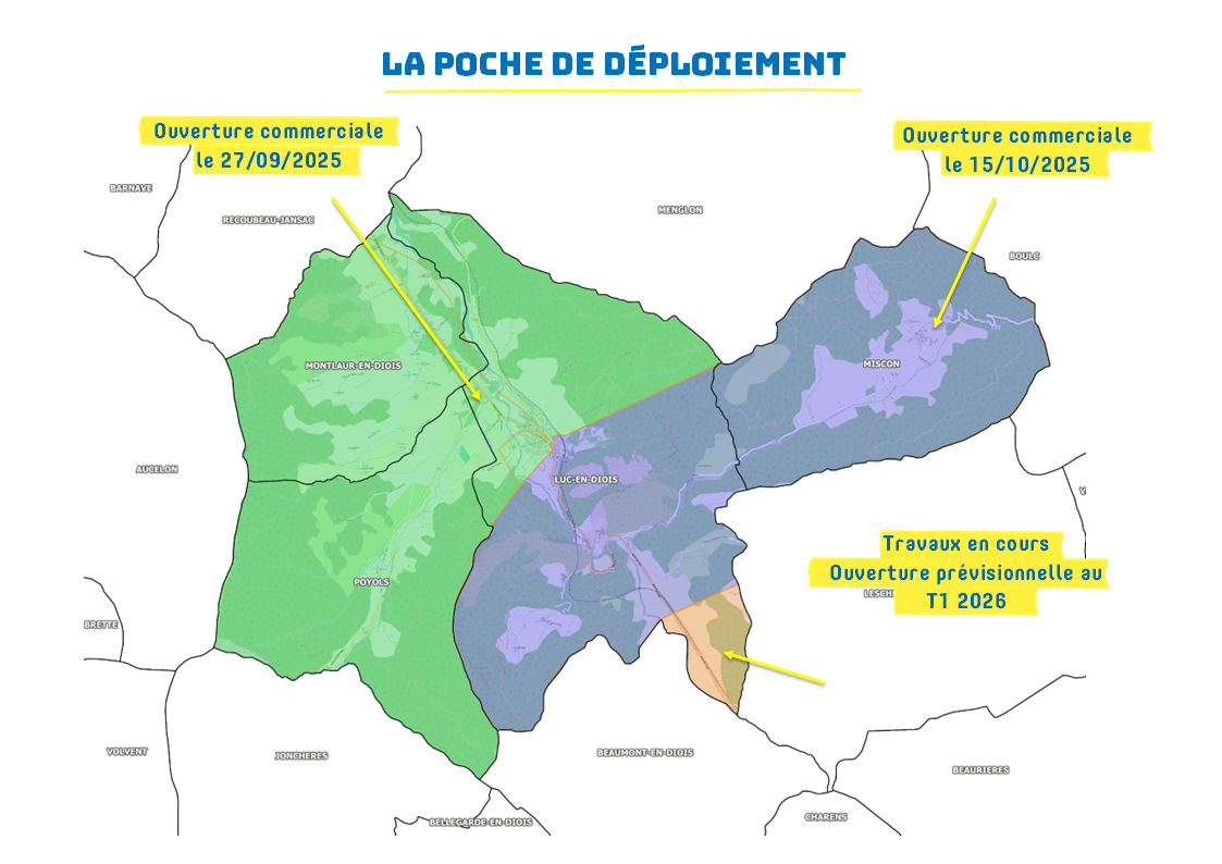 La commercialisation des services fibre a ensuite démarré le 15 octobre sur Miscon et le reste de Luc-en-Diois (périmètre en bleu).