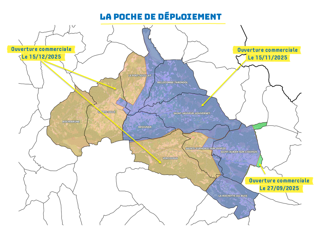 La commercialisation des services fibre démarrera ensuite le 15 décembre sur les communes du Poët-Sigillat, Rochebrune, Sainte-Jalle, Vercoiran et le reste de Sainte-Euphémie-sur-Ouvèze (périmètre en orange).