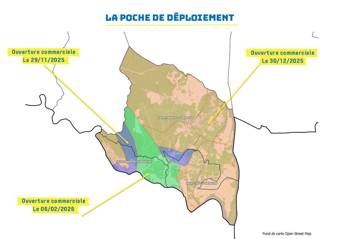 Depuis le 29 novembre, la fibre est disponible sur une première partie des communes de Saint-Just-d’Ardèche, Saint-Marcel-d’Ardèche et Saint-Martin-d’Ardèche (périmètre en bleu). La commercialisation des services fibre a ensuite démarré le 30 décembre sur de nouveaux secteurs sur les 3 communes (périmètre en orange), puis le 6 février sur le reste des 3 communes (périmètre en vert).