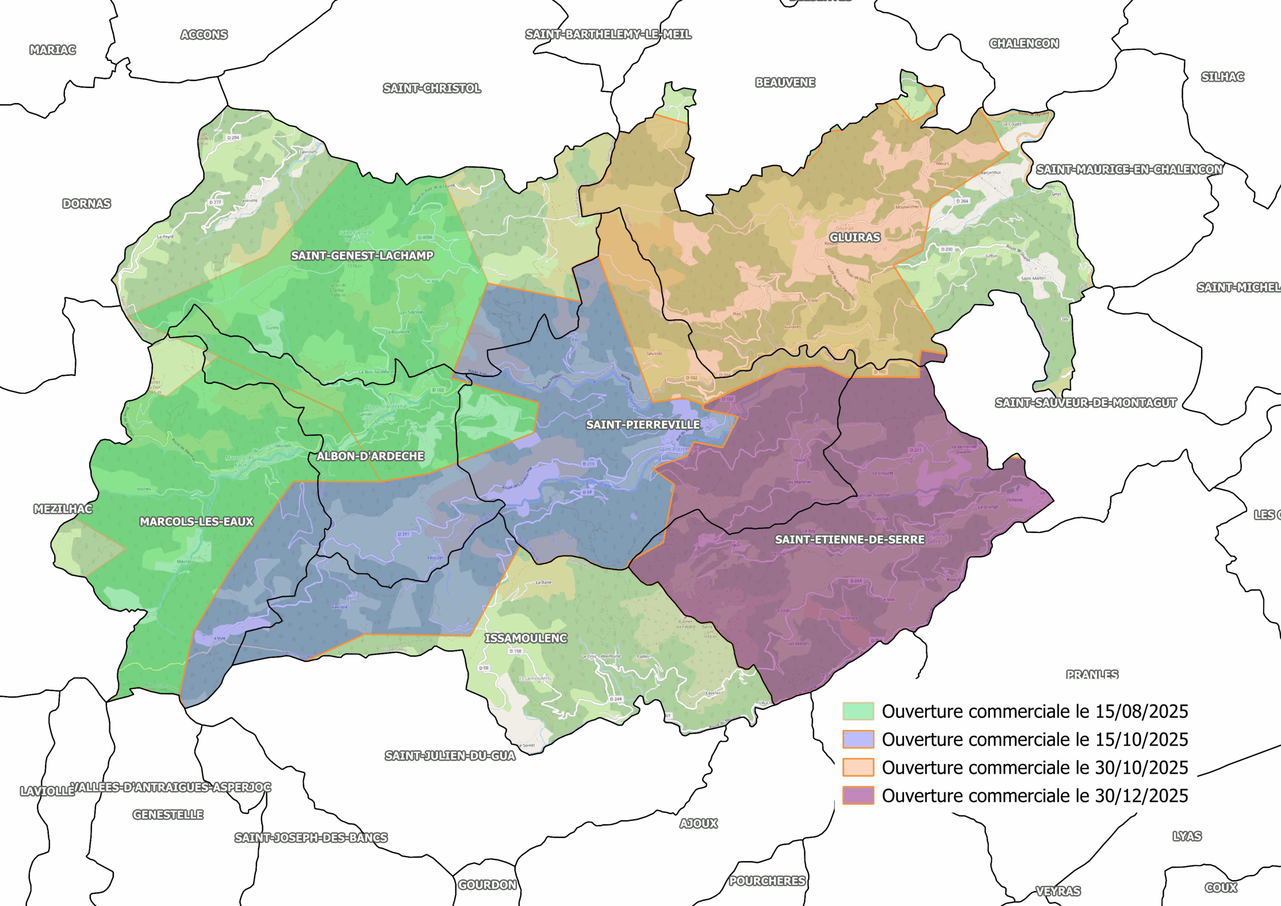 À la même date, les premiers secteurs de Saint-Pierreville et d’Issamoulenc ont également été ouverts à la commercialisation. Pour Saint-Pierreville, un secteur supplémentaire a été ouvert le 30 octobre 2025, et le reste de la commune sera disponible à partir du 30 décembre 2025. Pour Issamoulenc, un nouveau secteur sera ouvert le 29 novembre 2025, puis le reste de la commune courant du 1er trimestre 2026.
