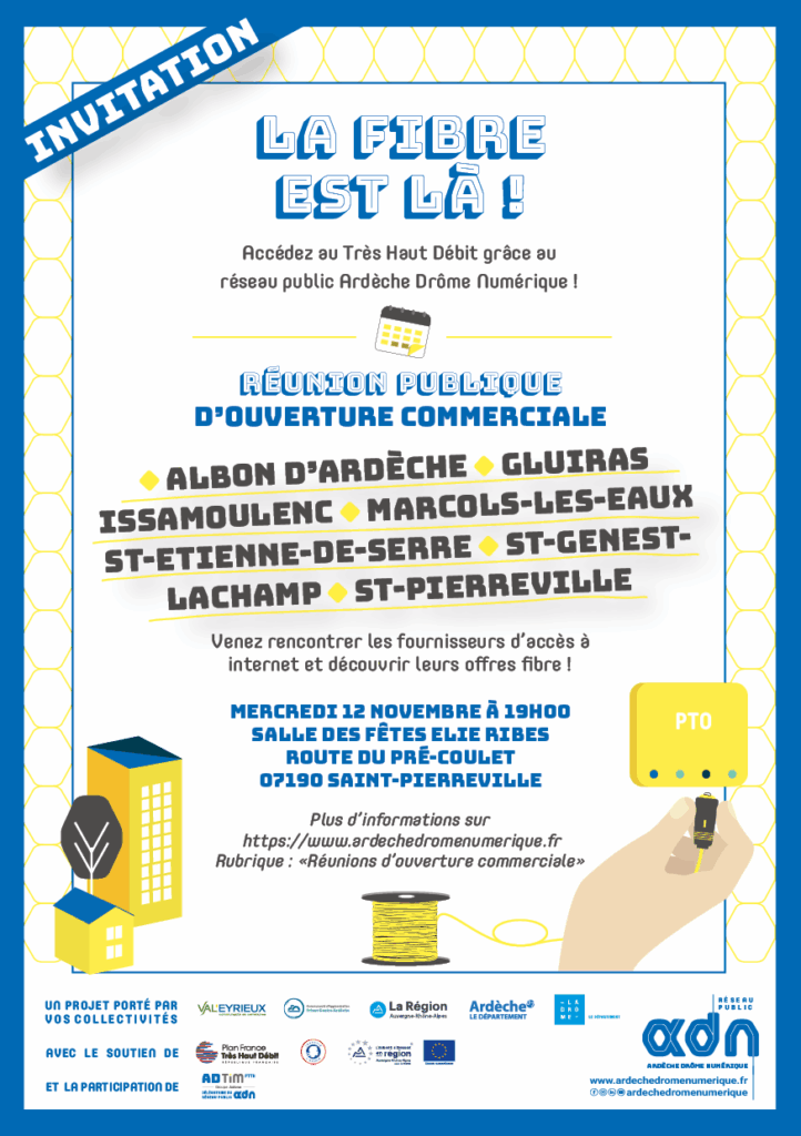Le Syndicat mixte ADN et l’exploitant du réseau ADTIM FTTH ont le plaisir de vous convier à la réunion publique d’ouverture commerciale fibre pour les communes de Creyseilles, Saint-Priest et Veyras :
