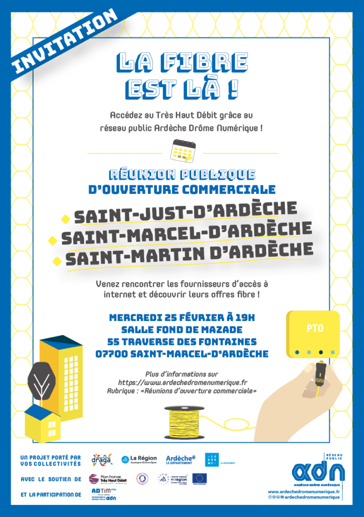 Le Syndicat mixte ADN et l’exploitant du réseau ADTIM FTTH ont le plaisir de vous convier à la réunion publique d’ouverture commerciale fibre pour les communes de Saint-Just d’Ardèche, Saint-Marcel-d’Ardèce, Saint-Martin-d’Ardèche.
