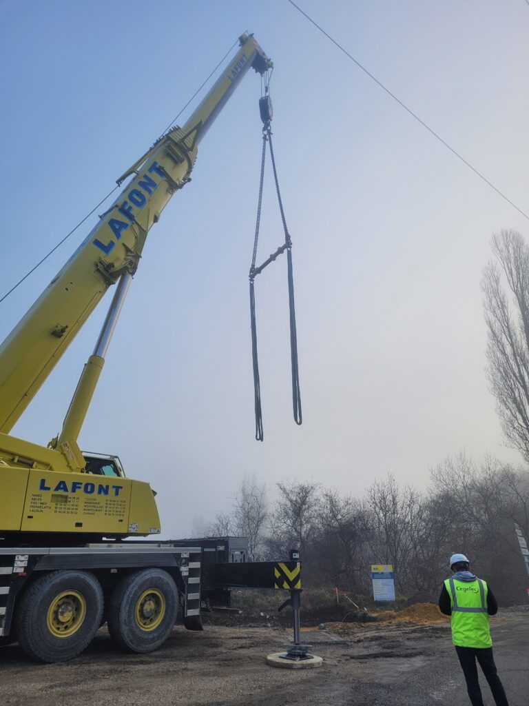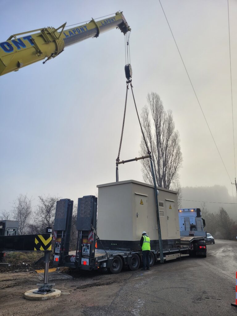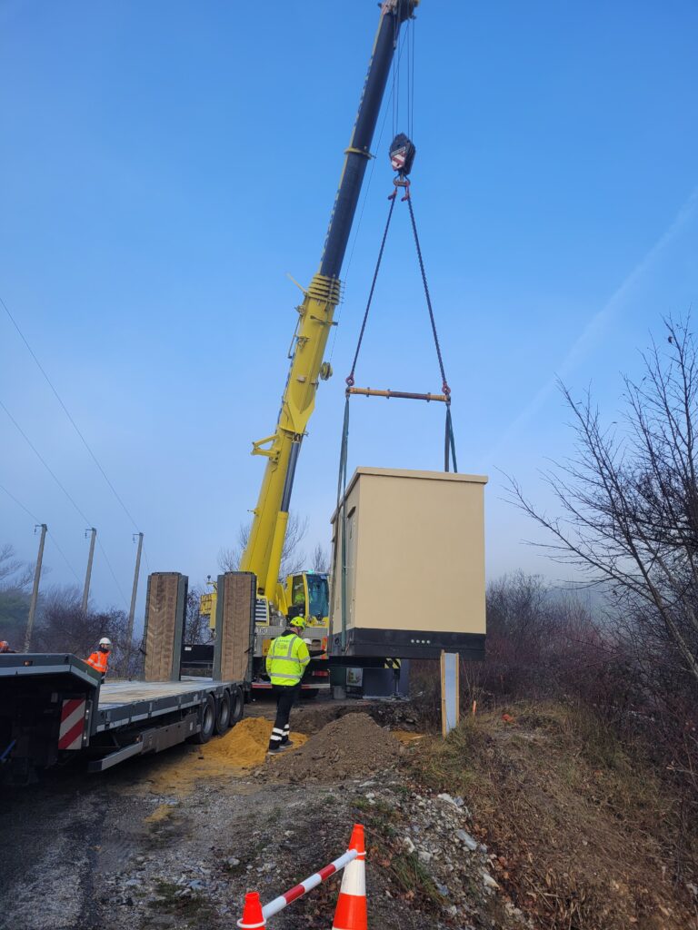 Livré directement maçonné, le local a été installé à l’aide d’une grue à un emplacement dédié, où une chambre de tirage ADN avait été implantée au préalable pour interconnecter le local au réseau fibre prochainement déployé.